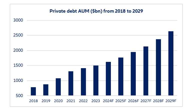 Private credit has experienced a dramatic expansion over the past decade, driven by tighter banking regulations, growing institutional demand for yield, and the increasing role of private markets in corporate financing. As the chart shows, global private debt assets have grown steadily from 2018 onward and are projected to surpass 2.5 trillion dollars by 2029. This sustained rise highlights the structural shift taking place in global lending and sets the foundation for the asset class to play an even more central role in the years ahead.