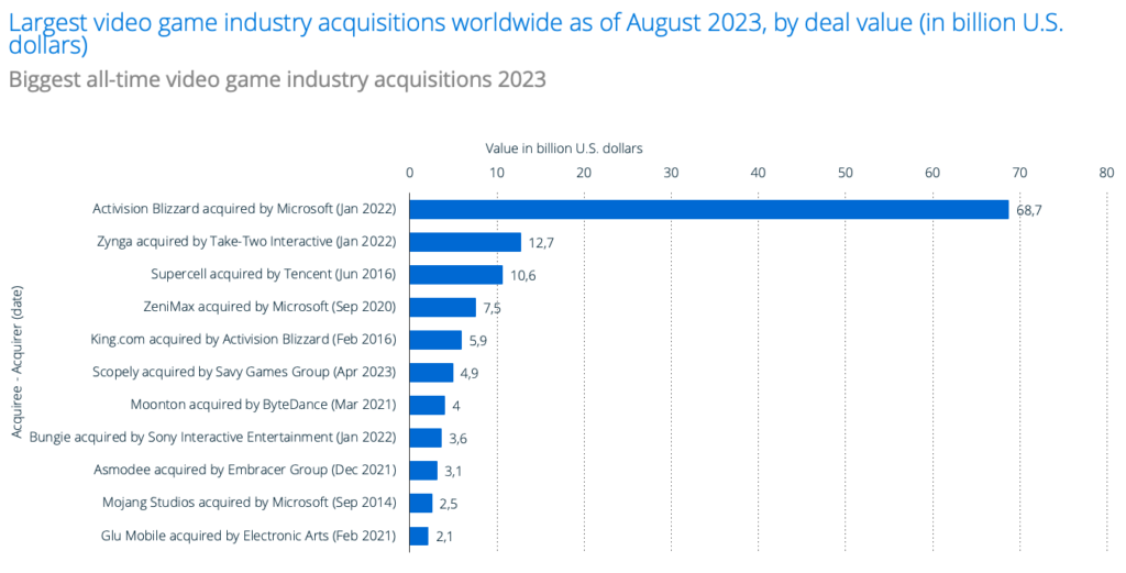 To fully grasp the scale of the transaction, it is essential to compare it with previous acquisitions in the gaming industry. While consolidation has been accelerating in recent years, no deal comes close to the magnitude of Microsoft’s acquisition of Activision Blizzard.